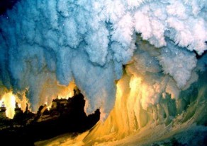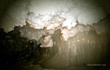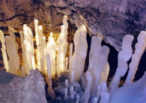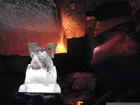 Это - подземный дворец! Сюда не проникает солнечные лучи, поэтому даже летом держится минусовая температура. Капли воды, просачиваясь сквозь трещинки, образуют сосульки, которые растут сверху вниз (их называют сталактиты) и снизу вверх (их называют сталагмиты). В лучах цветных фонарей все это искрится, создавая удивительную яркую картину. Пещера состоит из множества гротов и переходов. Пещерные гроты имеют разные названия: "Полярный" (здесь царство льда). "Метеорный", "Коралловый", "Эфирный". Самый красивый из них - "Бриллиантовый грот", ледяные кристаллы, которого блестят и искрятся и при свете зажженных огней.